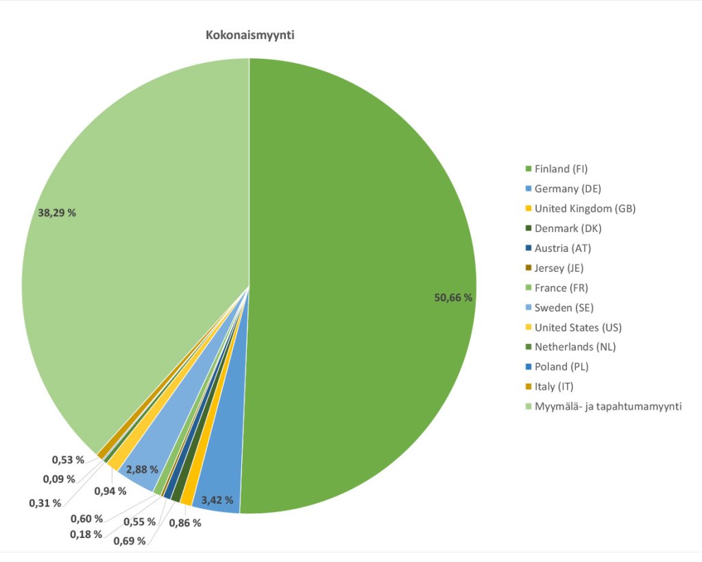 Verkkokaupan 62% on kuitenkin iso osa koko liikevaihdosta. Tähän osaan sisältyy myös kansainvälisen myynnin 11%, joten kotimaan verkkokaupan osuudeksi jää noin puolet. Mielenkiintoisena juttuna voisin tästä mainita sen, että kansainvälistä verkkokauppaa on ollut yhteentoista eri maahan. Vieläpä ilman isompaa yrittämistä tai mainostamista. Tämä on mielestäni aika hyvin ja selvästi osoittaa, että myös Suomesta voidaan tehdä verkkokauppaa kansainvälisesti. Toki kaupoissa on eroa, eikä oman yhden yrityksen otoksella kovin suuria johtopäätöksiä kannata tehdä. Oma kokemukseni kuitenkin on, että kivijalkakauppa ei ainakaan vielä ole jäänyt verkkokaupan jyräämäksi. Pikemminkin ne vain täydentävät toisiaan.